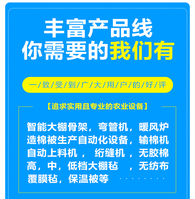 本公司設(shè)備齊全,可生產(chǎn)智能大棚骨架,彎管機(jī),暖風(fēng)爐等農(nóng)業(yè)設(shè)備,另制造棉被生產(chǎn)自動(dòng)化設(shè)備,自動(dòng)上料機(jī),輸棉機(jī),絎縫機(jī)等。質(zhì)量可靠,注重創(chuàng)新。公司擁有雄厚的實(shí)力,先進(jìn)的生產(chǎn)線(xiàn),豐富的經(jīng)驗(yàn),可根據(jù)客戶(hù)的要求定做高,中,低檔大棚氈,無(wú)紡布,無(wú)膠棉,覆膜氈,保溫被等,車(chē)間日生產(chǎn)新型棉被10000平方米以上,能滿(mǎn)足各種客戶(hù)的需求,新型保溫被產(chǎn)品在國(guó)內(nèi)研發(fā)中始終保持在前列。